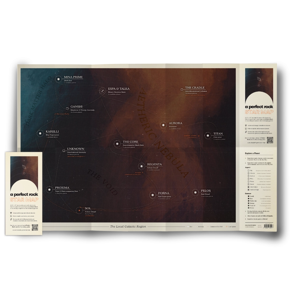 The Star Map is a 18"x28" fold-out map for your sci-fi adventures. Use it to search for a new home in A Perfect Rock, or as a setting to explore in other roleplaying games.